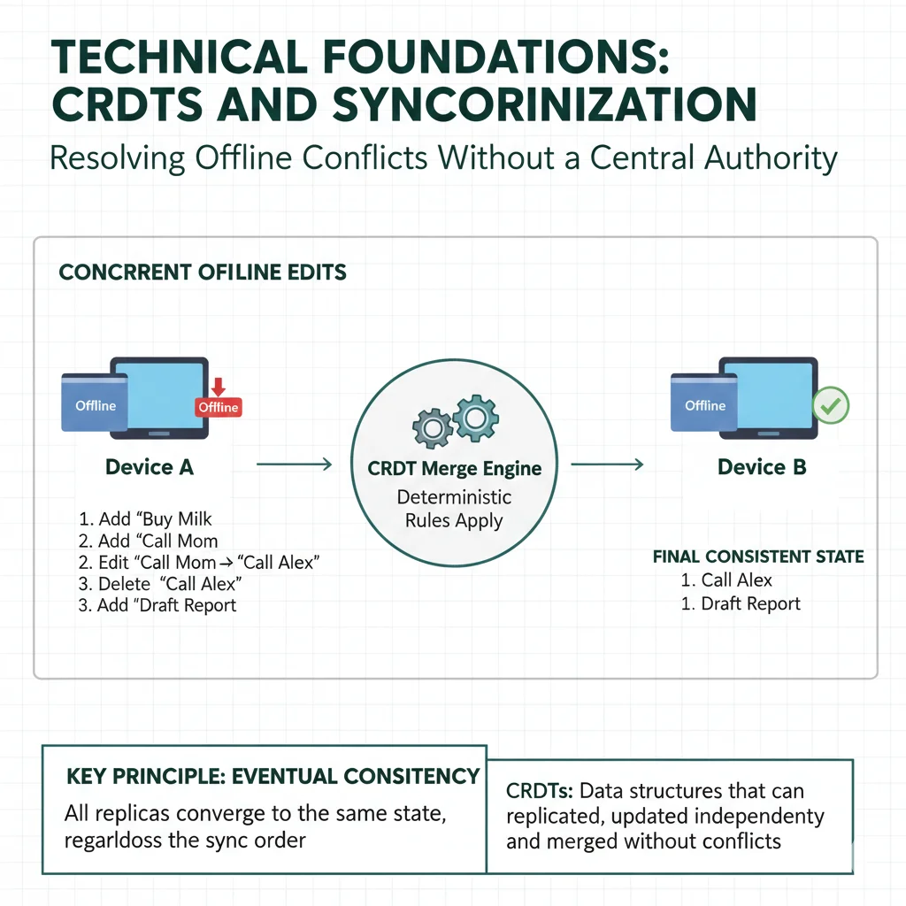Once every device can write independently, you need deterministic merge behavior. This is where distributed systems concerns enter frontend work.