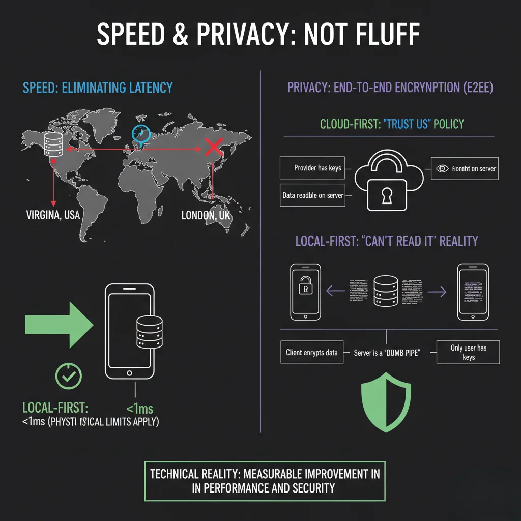 Local-first can improve privacy posture because plaintext does not need to leave the device for every operation.